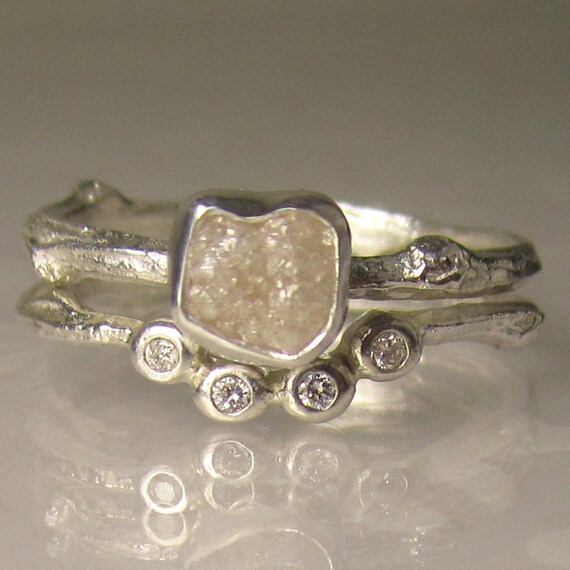 White Raw Diamond Engagement Ring Rough Diamond Wedding Set Raw Diamond Twig Ring