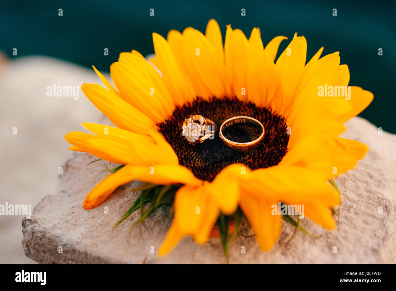 Wedding Rings On A Flower Of A Sunflower Wedding Jewelry